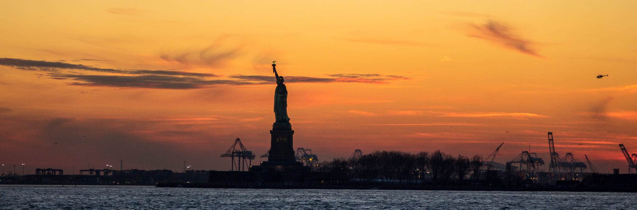 A continuación, el ferry se dirige a Governor’s island y Ellis Island para pararse unos minutos en uno de los puntos más esperados y fotografiados por los pasajeros del recorrido: la Estatua de la Libertad, donde llegamos justo al atardecer, con todos los naranjas del atardecer de fondo para poder hacer una espectacular foto de recuerdo de Lady Liberty.