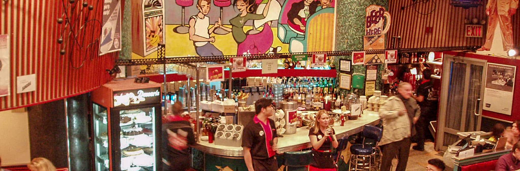 Ellen Stardust Diner es uno de los pocos diner originales que quedan en la ciudad de Nueva York, y se ha hecho famoso por unas buenas hamburguesas y sus camareros, que te amenizan la velada.